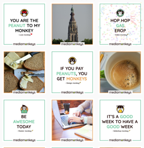 In de posts zijn de verschillende Monkeys verwerkt om een beeld te kunnen weergeven van de diensten. Daarnaast is aan de hand van de nieuwe ontworpen huisstijl van MediaMonkeys een vaste stijl ontworpen die aangehouden wordt, omdat uit onderzoek blijkt dat dit een standaard is voor een goede Instagram post (Yune.nl, 2015).